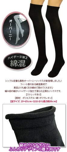 黒無地【ハイゲージ加工】綿混オーバーニーソックス♪やさしくフィットし細見せ美脚になれるブラックニーハイソックスが新登場♪【レディース・婦人・レッグウエア・タイツ・ストッキング・レギンス・靴下・コットン混】[冬物][秋物][春物][夏物]